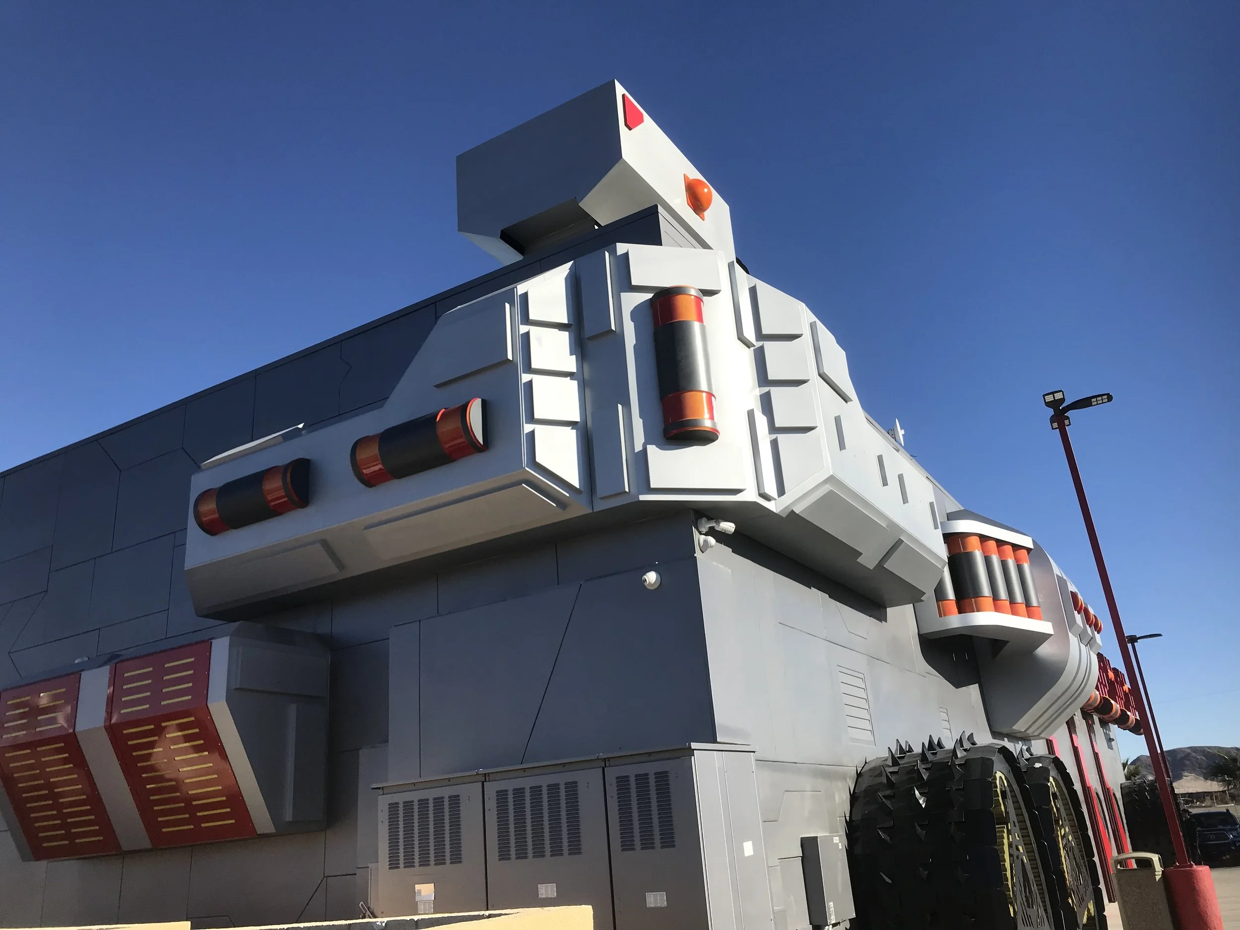 Flying Doghouse Productions has provided Creative Direction since the inception of this destination in Baker, CA. The client Alien Fresh Jerky proposed building a new 32-room UFO Hotel. While the design of the hotel is being completed, work began on the other buildings on the site. The existing store was remodeled to be the Rover which appeared when the spaceship landed and the kiosk and warehouse were designed to be buildings that would have been created by the aliens.